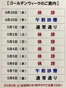 ゴールンウィーク期間中は休診日が続きます 🎌 下記の診療案内をご確認のうえご来院ください。